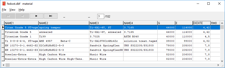 All databases can be sorted by any column by clicking with the right mouse button in the title field (here "DENSITY" or "DICHTE")