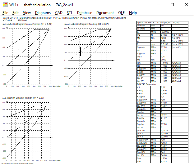 Under "View \ Position" you can calculate tension or pressure, bending stress and shear stress for every x-coordinate of the shaft. So far, the results have been displayed in a text window. Now, the results come as a screen graphic in a table, supplemented by Smith diagrams tension / compression, bending and torsion stress.