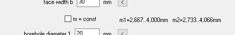 In the case of non-circular gears, one can calculate either with a variable module (m = 2 * r / z) or with a constant module. With a variable module, the min and max value of the gear pair is now displayed in the input window. If the m1,m2 printout disappears due to changed input: Click on "Calc" for recalculation.