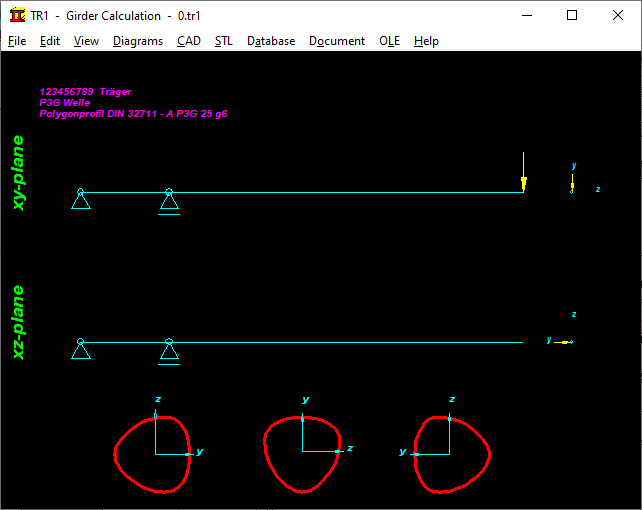 The polygon trochoidal shaft was added to the profile database for girder calculation. This allows shafts with a P3G profile to be calculated as a girder. However, only on tension / compression and bending, not on torsion. The number of corners can be entered. With 2 corners there is an ellipse. The more corners, the smaller the eccentricity must be. Otherwise there is the known effect of P4C profiles of limiting the usable profile by means of a circular arc. In TR1, there is also the option of importing any cross-section consisting of one polyline as a DXF file.