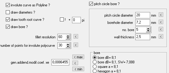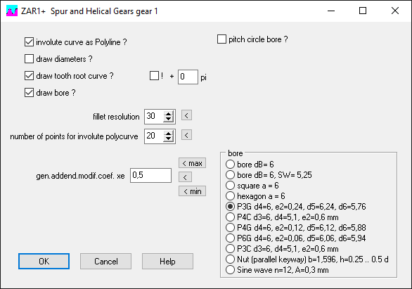 There are now various alternatives to a round hole for the production of gears with a 3D printer: flattened, square, hexagonal, P3G, P4C, P4G, P6G, P3C. In addition, a keyway and a sine wave. You do not have to enter any further dimensions, standard values are used. P3G data, for example, are d1 = dB, e2 = 0.04 dB (d5 = dB + e2, d6 = dB-e2). You can select and enter the options under "CAD \ Gear Wheels":