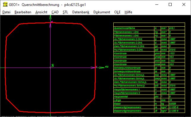 Ein Polygon-Trochoid mit 2 Ecken ergibt eine Ellipse. Mit 3 Ecken ein P3G Profil. Mit 4 Ecken ergibt sich eine P4C Kontur, aber ohne Begrenzung durch Kreisbogen. Eine richtige P4C-Kontur kann man aber auch in GEO1+ laden: in WN7 unter "Datei\Export DXF" bzw. "CAD\P4C" speichern, dann in GEO1+ unter "Datei\Import DXF" laden. In GEO1+ werden Fläche und Flächenmomente aus der Summe der Koordinaten berechnet. Ein Vergleich eines in GEO1+ generierten P3G Profils mit berechneten Daten aus WN6 ergibt eine gute Übereinstimmung bei Querschnittsfläche A und Flächenmomenten Ip und Ix. Der Schwerpunkt liegt genau im Nullpunkt. Das Widerstandsmoment Wmin ist I/rmax mit rmax=d2/2. Bei Wx=Ix/d2/2 gibt es eine gute Übereinstimmung, bei Wp=Ip/d2/2 gibt es eine Abweichung von ca. 10% mit Wp aus DIN 32711.
