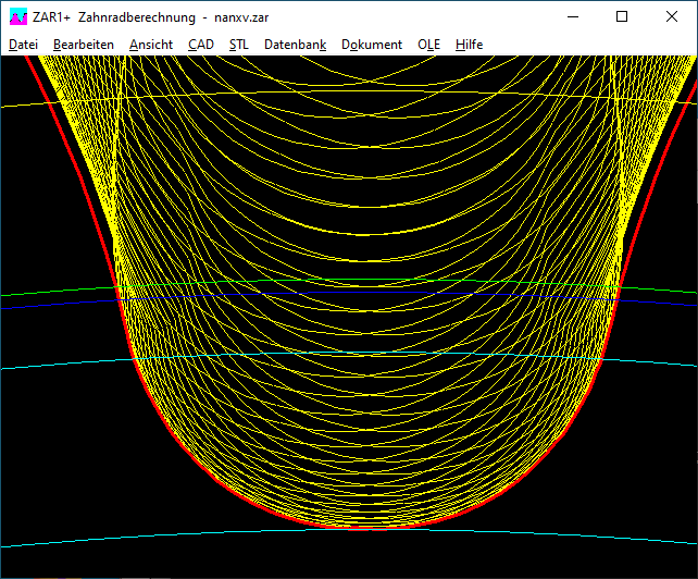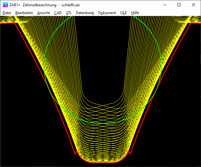 Schon wieder hat ein Kunde ein Zahnprofilbild geschickt mit einem Zacken vom Übergang der Evolvente in die Zahnfußausrundung mit der Frage, ob das ein Fehler in der Software sei. Die Überprüfung seiner Berechnungsdatei ergab, dass eine Bearbeitungszugabe q eingegeben wurde, aber ein normales Bezugsprofil (kein Protuberanzprofil) verwendet wurde. Dann gibt es Schleifkerben, und diese sieht man auch im Zahnprofilbild.