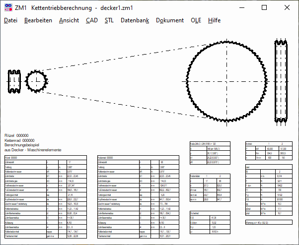 Umfangreiche Änderungen gab es bei der ZM1-Software zur Berechnung von Rollenketten und Kettenrädern. Die Software ZM1 für Kettentriebe wurde an die ISO 606:2018 angepasst. Die ISO 606 ersetzt die alten DIN-Normen 8186, 8187, 8196. Die Kettengrößen sind teils identisch mit DIN 8187/8188, teils unterscheiden sie sich. Manche Kettengrößen aus der DIN wurden unter anderer Bezeichnung in ISO 606 übernommen. Beispiel: aus "08A" wird "40" und aus "085" wird "41". Es gibt jetzt eine neue Datenbank ISO606.DBF mit Kettenabmessungen nach ISO 606. Diese enthält 100 Datensätze, enthalten sind auch die verstärkte Ausführung "H" und die extra verstärkte Ausführung "HE". Die alte Datenbank mit DIN-Ketten ist zusätzlich verfügbar, dass auch alte Berechnungsdateien weiterhin fehlerfrei geöffnet werden. Bei Auswahl der Kettengröße ist sowohl die alte als auch die neue Datenbank verfügbar. Um alte Berechnungen auf die neuen ISO-Bezeichnungen umzustellen, öffnet man die Berechnungsdatei, dann einfach unter Bearbeiten\Abmessungen die entsprechende Kettengröße aus der ISO606-Datenbank wählen, Berechnungsergebnisse vergleichen und speichern.