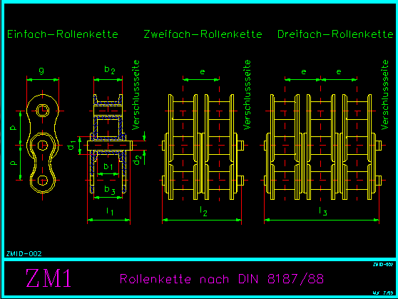 Die Kurzbezeichnungen im ZM1 Ausdruck und Quick-Ansicht wurde nicht generell auf die ISO-Bezeichnungen umgestellt: Je nachdem ob man eine Kette aus der DIN-Datenbank oder der ISO-Datenbank gewählt hat, sind die ausgedruckten Kurzzeichen nach DIN oder nach ISO. So kann man sich an die neuen Bezeichnungen gewöhnen, oder die alten beibehalten. Beispiel: Der Rollendurchmesser ist jetzt "d1" statt "dR". Verwirrend: der Teilkreisdurchmesser von Rad 1 ist ebenfalls "d1". Und "dR" ist jetzt der Prüfstiftdurchmesser für Messung des Fußkreisdurchmessers mit Prüfmaß dM. Und "Fu" ist nicht die Umfangskraft, sondern die Mindestbruchkraft der Kette.