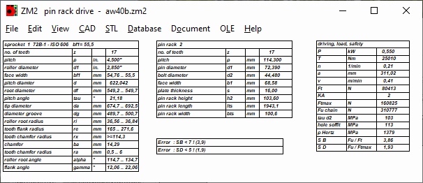 ZM2 is a new software for calculating pin rack gears. A pin rack is a simple rack with bolts welded in between two metal sheets (instead of involute teeth). The drive wheel is a sprocket according to ISO 606 or DIN 8187/8188. The dimensions can be selected from the database or you can define special dimensions yourself. The dimensions of the pin rack correspond to the dimensions of the corresponding chain. As an alternative to a pin rack, a chain can be clamped in linear fashion. The sprocket for the rack toothing must be a little thinner than for a chain drive. Because of this, and above all because there is usually only one tooth in mesh with the pibn rack, the strength and hardness of the sprocket must be higher than when used as a chain sprocket. ZM2 calculates Hertzian pressure between the pin rack and the sprocket as well as the shear stress and pressure of the pin and the pin rack.