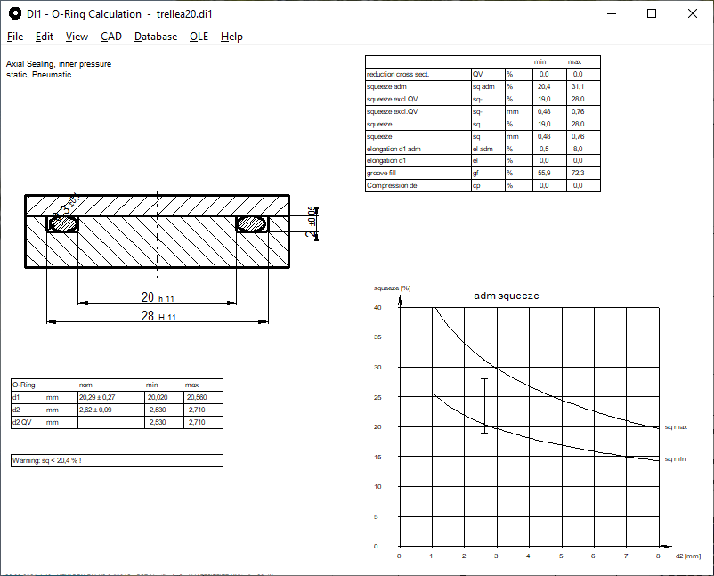 When an O-ring is pulled onto a piston or stretched in the groove, its cord diameter is reduced. When the O-ring is compressed, however, its cord diameter does not increase, instead it finds its place in the groove. In the case of axial sealing, DI1 incorrectly calculated increased cord diameter by negative stretching if the inside diameter of the groove was smaller than the inside diameter of the O-ring. This resulted in too high values for the squeeze. If the O-ring is compressed, it seeks its place in the groove. Therefore, the groove filling is no longer calculated from the O-ring cross-section and the groove cross-section, but from the O-ring volume and the groove volume.
