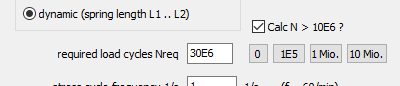 For some time now it has been possible to enter the required number of load cycles. The only purpose of this is to compare the calculated number of load cycles with the required number and to output an error message if it is exceeded. The spring is fatigue safe with 10 million load cycles. What happens now if you enter more than 10 million load cycles required? So far, a lower permissible stress variation has also been calculated from this, which provides additional safety. But if you assume that the spring, if it can withstand 1E7 load cycles, can also withstand an infinite number of load cycles, then it does not matter whether you enter 10 million load cycles or 10 billion load cycles. In the new versions there is now an option "Calc Nreq> 10E6?", Then a virtual number of load cycles is calculated beyond 1E7, this is an additional safety compared with 1E7 cycles. Otherwise it is assumed that the spring can withstand an infinite number of load cycles if it can withstand at least 10 million load cycles.