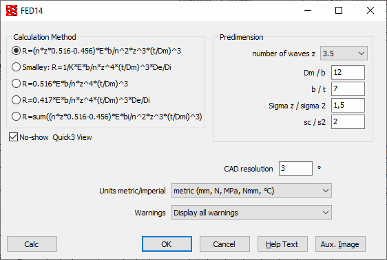 Because there is no binding standard for calculating helical wave springs, you can choose between different calculation methods: as a flat wave strip with different methods for taking the coil diameter into account, or with formulas and table values according to Smalley. The display of the calculation formula in the Quick3 view can now be switched off. Useful when forwarding the Quick3 printout, for example from the spring manufacturer to the customer, in order to avoid queries.