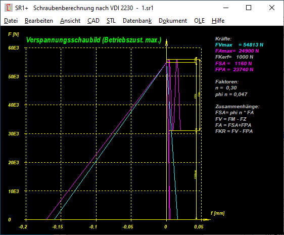 Verspannungsschaubild "Betriebszustand min" ist die Darstellung mit der kleinsten Montagevorspannkraft, aber mit der größten Zugkraft FA (FAo). Daraus erhält man die (kleinste) Restklemmkraft FKR.