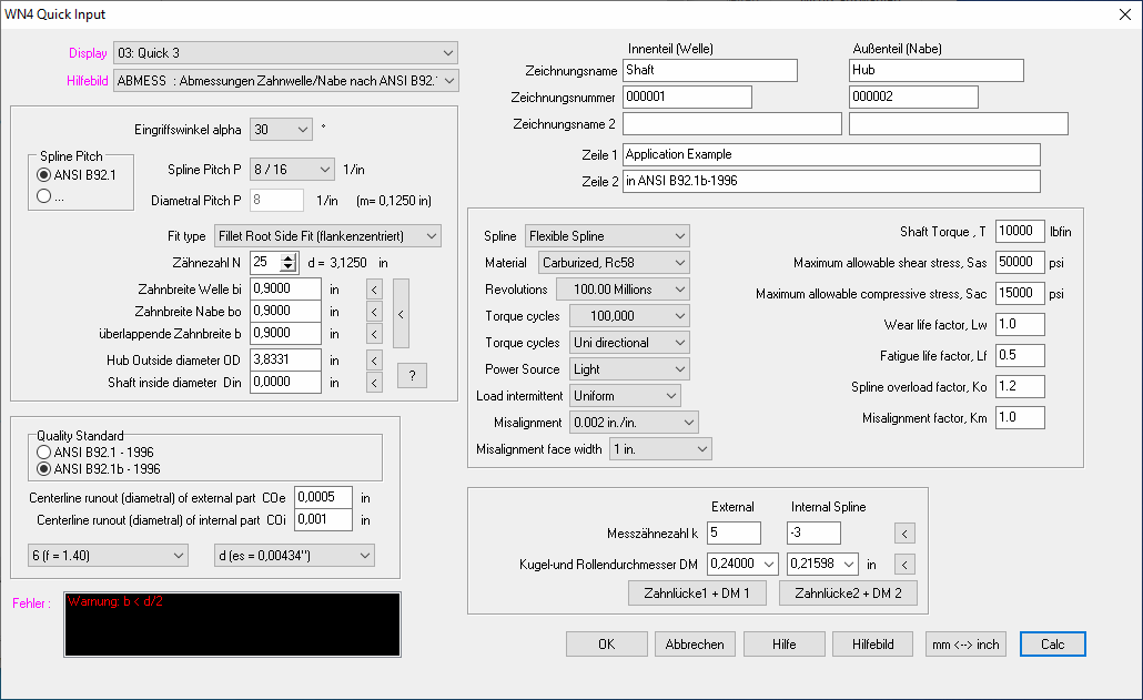 Wird ein großes Flankenspiel gewählt, dann wird bei Herstellung im Abwälzverfahren außer der Zahndicke auch der Kopf- und Fußkreisdurchmesser kleiner. Wenn der Kopfkreisdurchmesser kleiner wird als die Untergrenze der ISO-Toleranz h11 (H11 bei Innenverzahnung), dann gibt es jetzt eine neue Fehlermeldung. Um die Warnung zu vermeiden, kann man das Zahnspiel auf Welle und Nabe verteilen. Beispiel: Toleranzpaarung D7/c7 statt H7/a7.