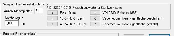 Die pressung.dbf Datenbank mit Werkstoffdaten der Klemmplatten der deutschen und englischen Version unterscheiden sich, sie sind nicht austauschbar. Bitte beachten, wenn Sie deutsche und englische Version verwenden. In der englischen Version wurde jetzt ein Fehler beim E-Modul des Werkstoffs "SF Cu F24" festgestellt, hier muss 123000 MPa stehen, nicht 12300. Bitte korrigieren unter "Database\Material Plates\Nut\Base data 0 (pressung.dbf)".