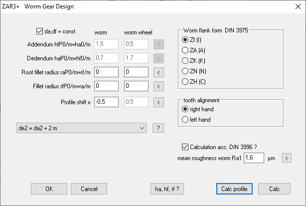 Mit "Calc Profile" werden die eingegebenen Zahnhöhenfaktoren berechnet und eine Zahnformzeichnung von Schnecke und Schneckenrad angezeigt.
