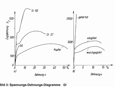 Ductility is the property of a material to permanently deform under load before fracture. In the picture on the left, St60, St37 and copper are ductile. But not GG (cast iron). In the right picture, tempered or annealed steels are ductile, but hardened ones are not. Surface-hardened steels have a soft core and therefore deform ductilely.