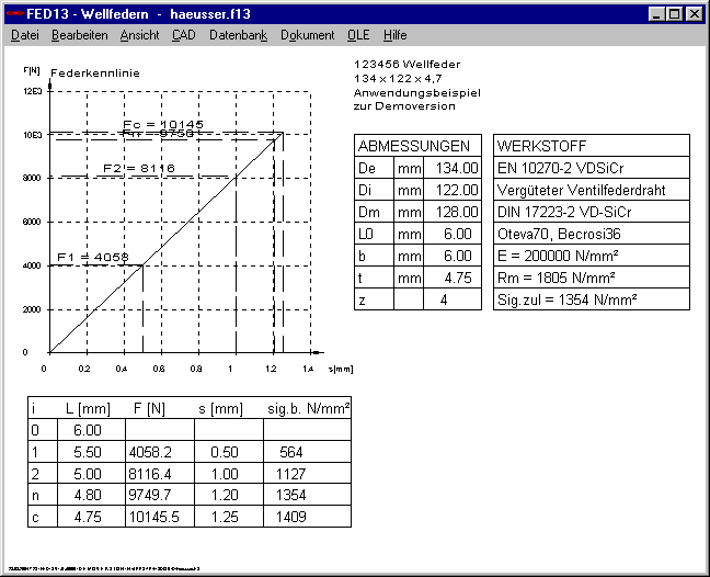 Nach Eingabe von Abmessungen und Einspannlängen L1, L2, berechnet FED13 die Federkennlinie und Spannungen.