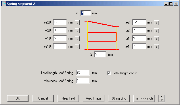 Until now, only symmetrical leaf springs could be calculated with FED10. Input is easy for symmetrical leaf springs, sections are simply defined by width and length. New version 2.0 supports also asymmetrical leaf springs. Asymmetrical loads (that cause torsion) are not supported, all loads are centric. Input of asymmetrical geometry is not as easy, you must define internal and external coordinates of each section. For internal calculation, asymmetrical leaf spring is converted into a symmetrical leaf spring geometry of identical properties.