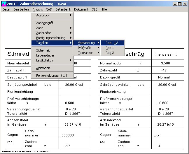 Das Ansicht-Menü wurde übersichtlicher strukturiert mit Untermenüs, so daß die gewünschte Darstellung schneller gefunden und angezeigt werden kann. Unter "Ansicht->Tabellen" wurden Tabellen mit Verzahnungsdaten, Prüfmaßen und Toleranzen neu aufgenommen.