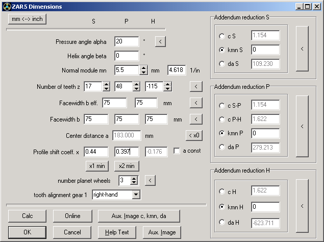 Until now, it was somehow confusing that previously input was overwritten if you entered another value. Now, xH is no longer an input value, but is calculated from xS, xP and center distance a. If you enter xS and xP, xH and a are calculated by ZAR5. If you select "a=const", xS and xP will be modified. For ring gears, number of teeth and profile shift (zH and xH) are negative.