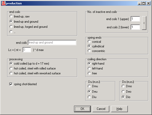 You can now select dimensioning of inner, outer and central coil diameter for upper and lower end of the spring (at "Edit->Production). Until now, it was fixed to center diameters Dmu and Dmo.
