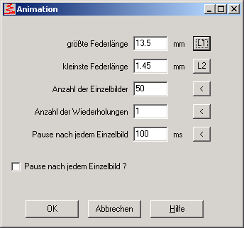 Vor einigen Jahren noch lief die Animation einer Kegelfeder mit den damaligen Computern ziemlich langsam ab, weil die Berechnung der Kegelfeder recht aufwändig ist. Mit einem heute üblichen PC läuft die Animation mit den Vorgabewerten so schnell ab, daß man keine Feder mehr erkennen kann. Die Vorgabe für die Anzahl der Einzelbilder wurde von 20 auf 50 erhöht, außerdem kann man jetzt eine Pause zwischen den Bildern einstellen (Vorgabe 100 ms).