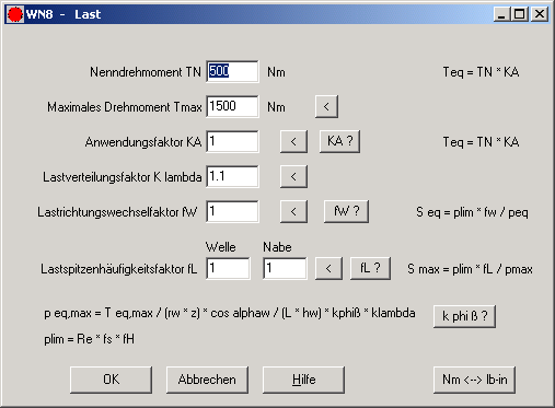 Der Faktor K lambda berücksichtigt die Lastverteilung bei Passfedern über die Nutlänge. Für den häufigsten Fall "Lastverteilung mitte" und "D/d > 1.7" (Nabendurchmesser/Wellendurchmesser) kann man mit dem "<" Button den Diagrammwert aus DIN 6892 berechnen lassen.