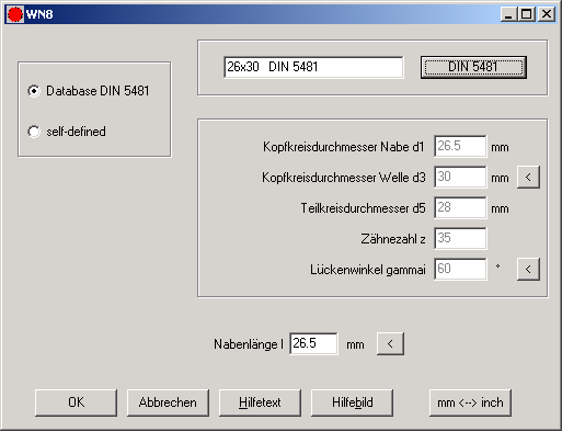 Für die Berechnung von Kerbverzahnungen gibt es eine neue Software. WN8 berechnet nicht nur die Größen nach DIN 5481 (in der neuesten Ausgabe wurden die Durchmesser größer 60 mit Keilwinkel 55° ersatzlos gestrichen), man kann auch abweichende Abmessungen und Zahnwinkel eingeben.
