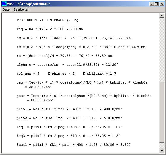 In der neuesten Version von WN2 wird die Berechnung nach DIN 5466 (Entwurf 1995) nicht mehr unterstützt. Dafür wurde die Berechnung nach der neuesten Auflage 2005 von Niemann Maschinenelemente Band 1 aufgenommen. Die Ermittlung der zulässigen Flächenpressung wird dabei aus DIN 6892 (Paßfederverbindungen) übernommen. Für die Berechnung der maximal auftretenden Flächenpressung werden ein Anteilfaktor (für Genauigkeit und Flankenverschleiß) sowie ein Längenfaktor (für Lastverteilung über tragende Länge) nach DIN 6892 verwendet.