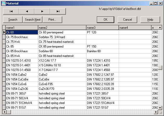 The integrated material database includes mostly used spring steel plate materials. Database may be modified and extended by the user.