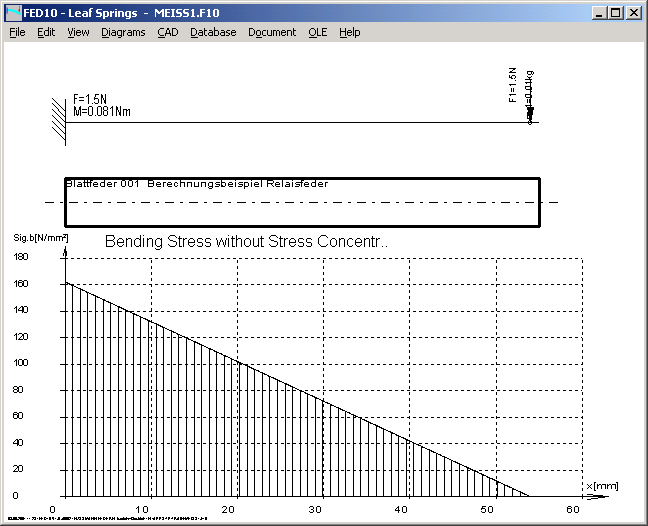 FED10 displays diagrams of radial force, bending moment, bending angle, deflection, bending stress, tension and reference stress. Diagrams can be printed or exported to CAD or other software via DXF or clipboard.