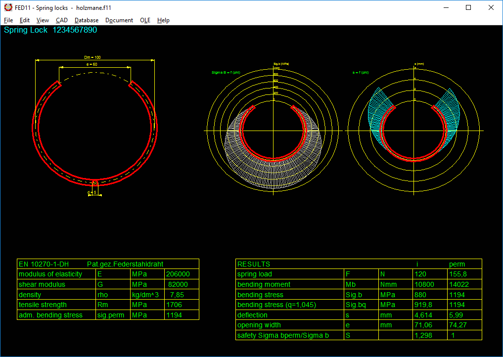 FED11 calculates stress curve and deflection curve of the spring lock. Diagrams can be printed or exported to documentation via DXF or clipboard.