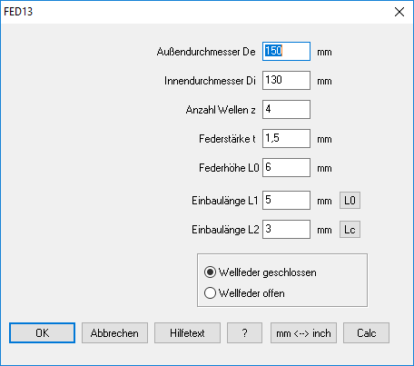 Aus den Abmessungen von ringförmigen Federn mit sinusförmigen Wellen berechnet das Programm Federkennlinie und Biegespannung für axiale Belastung. Eingabedaten sind Außen- und Innendurchmesser, Blechdicke, Anzahl der Wellen, Höhe der Wellfeder L0. Für die Einbau- bzw. Arbeitslängen L1 und L2 werden Federkräfte und Spannungen berechnet. Der Werkstoff wird aus der integrierten Datenbank gewählt.