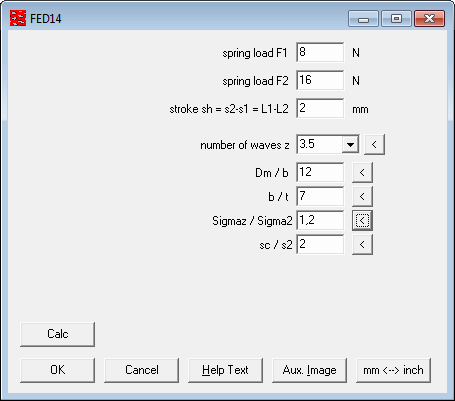 In Pre-Dimension, you can calculate dimensions of a helical wave spring by input of only one or two spring loads and spring deflection or stroke. By means of coil ratio, stress safety sigmaz/sigma2, block safety sc/s2 and number of waves you can modify dimensions.