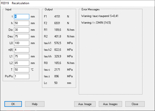 From the dimensions of the spring (spring strip thickness and spring strip height, upper and lower coil diameter, spring length and number of coils), FED19 calculates spring forces, spring deflection, spring rate, spring energy, stresses,spring length, weight. The coil pitch (Po/Pu) can be constant or linearly increasing/decreasing.