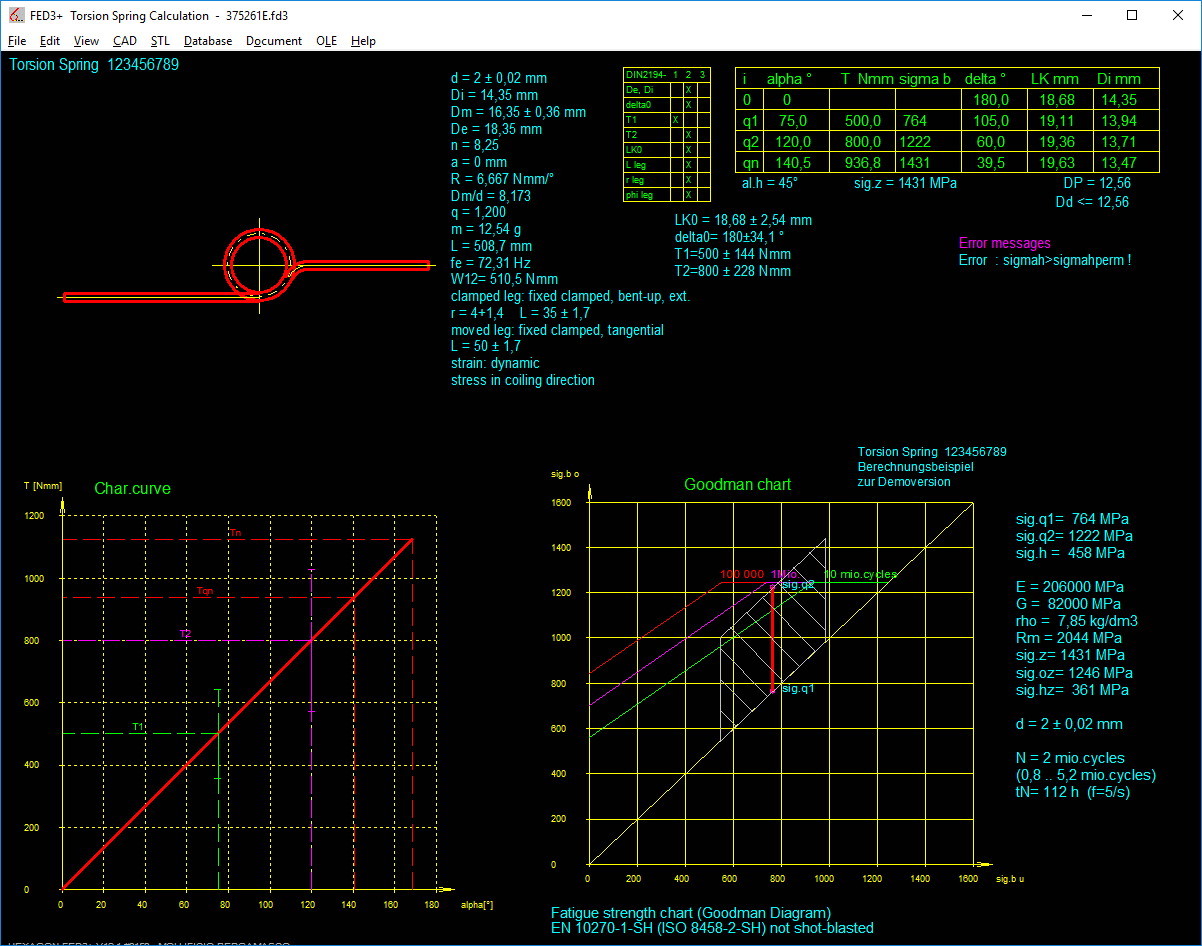 The spring characteristic curve as a diagram made up of rotation angle and torque, as well as a Quick output with characteristic line and the most important characteristic values are displayed graphically on screen. With dynamic load, you can ascertain the safety margin for failure and the expected life expectancy from the Goodman diagram.