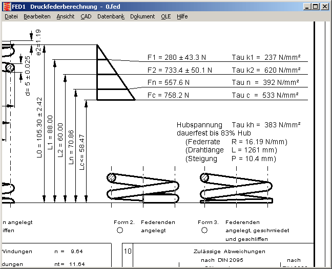 In der Fertigungszeichnung werden Drahtlänge (Einzugslänge) und Windungssteigung mit ausgegeben, wenn zuvor unter Bearbeiten->Fertigungszeichnung "Anzeigen L, P" angekreuzt wurde.