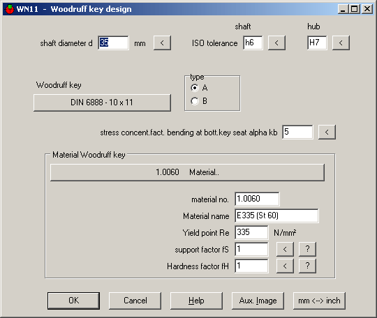 New WN11 Software calculates load bearing capacity of Woodruff key joints according to DIN 6892. This standard is specified for parallel keys, but can also be used for Woodruff keys, if load-bearing length and load-bearing height are replaced by load-bearing areas of shaft groove, hub groove and Woodruff key.