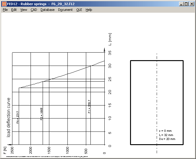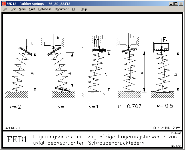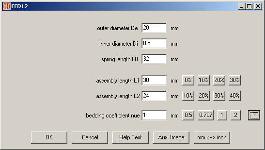 New version 2.0 of FED12 software for elastomere springs calculates buckling load Fk. Also the safety against buckling Fk/F2, relative to spring position 2. At "Edit->Dimensions" you can enter the bedding coefficient nue, which is essential for buckling load calculation:
