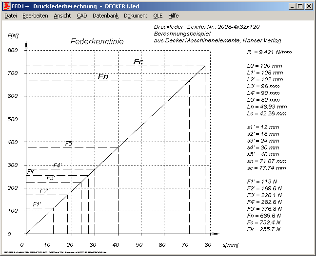 Unter "Bearbeiten->Nachrechnung Federkennlinie" kann man jetzt bis zu 6 zusätzliche Federlängen (FED1+, FED2+) bzw. Federwinkel (FED9) eingeben, die im Ausdruck oder unter Ansicht->Federkennlinie F'-s' angezeigt werden. Um Verwechslungen mit L1 und L2 zu vermeiden, wird an den Index ein Hochkomma angehängt (L1', L2'.. L6').