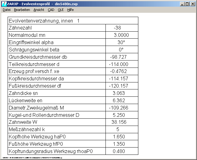 Bei Innenverzahnung werden Zähnezahl und Durchmesser mit negativem Vorzeichen ausgegeben.