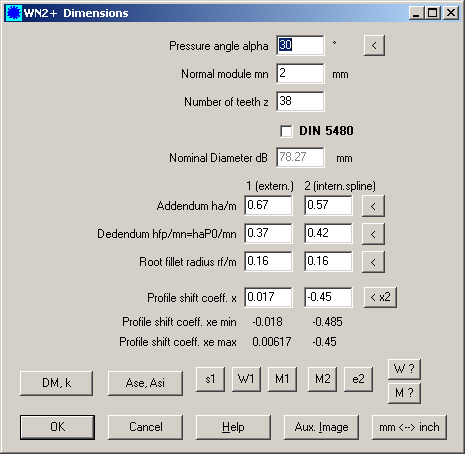 New version of WN2+ allows input of tooth thickness of external spline and tooth gap width of internal spline (buttons s1 and e2) to recalculate addendum modification coefficient and get the required backlash.