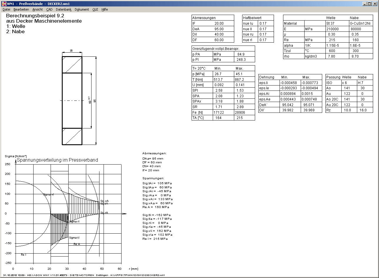 Bei abgestufter Nabe berechnet WN1 Pressung und übertragbares Drehmoment für jeden Abschnitt. Den Verlauf über die Nabenlänge kann man jetzt als Diagramm anzeigen.