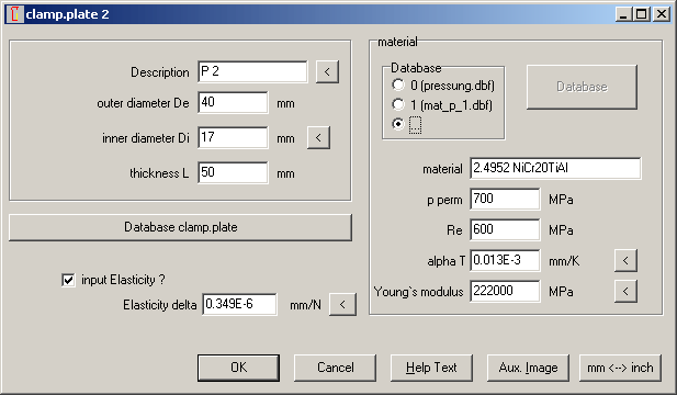 Material data can now be entered directly, without material database. Select ".." at "Database", then enter permissible pressure, yield point, thermal expansion coefficient, and modulus of elasticity.