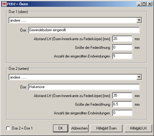 Bei der Berechnung von Drahtlänge und Ösenspannung wird unterschieden zwischen Ösen als Teil der Feder und eingerollten oder eingeschraubten Ösen oder Laschen (Bild A.9 bis A.12). Selbstdefinierte Ösen wurden bisher als eingerollte Ösen berechnet. Das wurde jetzt geändert: wenn die Anzahl eingerollter Endwindungen 0 ist, wird die Öse als Teil der Feder berechnet, ansonsten als externe Öse. Bei externen Ösen wird in der neuen Version außerdem die Drahtlänge genauer berechnet.