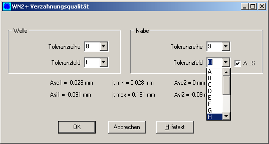 Nach DIN 5480 gibt es für die Zahnwelle die Toleranzfelder a bis v zur Auswahl, für die Zahnnabe dagegen nur die Toleranzfelder F,G,H,J,K,M. In WN2+ kann man jetzt für die Zahnnabe weitere Toleranzfelder von A bis S wählen, wenn man zuvor das Kästchen "A..S" anklickt.
