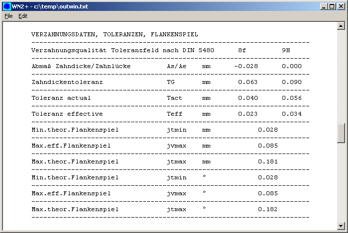 Zusätzlich zum theoretischen Flankenspiel jtmin und jtmax wird das maximale effektive Flankenspiel jvmax in mm, sowie das entsprechende Drehflankenspiel in Winkelgrad ausgegeben. Für die maximale Verdrehung von Nabe und Welle ist das effektive Flankenspiel ausschlaggebend, da aufgrund von Form-, Winkel- und Teilungsabweichung die maximale Verdrehung der gesamten Paßverzahnung wesentlich geringer ist als das zulässige Flankenspiel eines einzelnen Zahns.