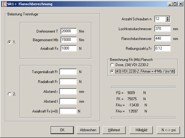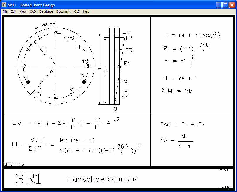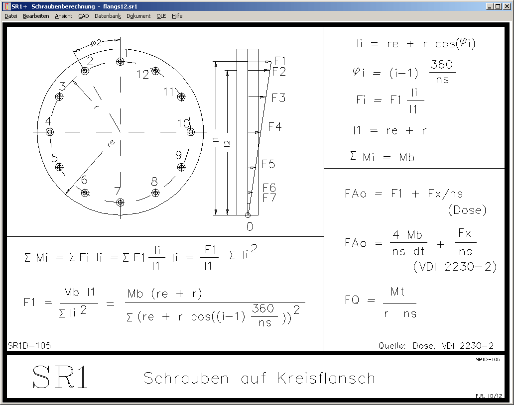 In SR1+ war diese Berechnung für eine Mehrschraubenverbindung auf einem Kreisflansch mit Schrauben auf einem Lochkreis auch bislang schon enthalten. So kann man jetzt vergleichen, ob die Berechnung nach Dose in SR1+ identisch ist mit den Formeln in VDI 2230 Blatt 2. Die Formeln nach Dose sind im Hilfebild SR1D-105 dargestellt: