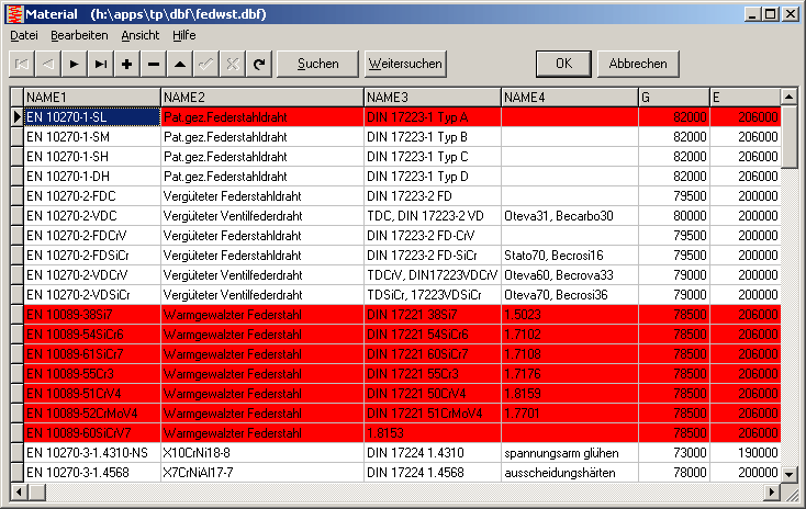 Durch laufende Aktualisierungen ist die Anzahl der Federdrähte mittlerweile auf die stattliche Zahl von 85 Werkstoffen angewachsen. Die Werkstoffauswahl wird dadurch unübersichtlich, weshalb die Frage aufkam, ob man hier eine Vorauswahl treffen kann. Wenn man nichtbenötigte Werkstoffe einfach löscht, gibt es Probleme beim Öffnen von früheren Berechnungen sowie mit eventuellen späteren Updates der Werkstoffdatenbank. Man kann aber auch unter "Datenbank->fedwst.dbf" die nicht benötigten Werkstoffe mit "-" Button zum Löschen markieren (tatsächlich gelöscht werden sie erst, wenn man "Bearbeiten->Pack" ausführt). Die Eingabe unter "Bearbeiten->Werkstoff" wurde so angepasst, daß zum Löschen markierte Werkstoffe nicht mehr angezeigt werden.