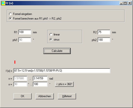 Für die Festlegung der Nockengeometrie in GEO4 gibt es verschiedene Möglichkeiten. Eine davon ist die Definition über mathematische Formel R = f (phi) mit R=Nockenradius und phi=zugehöriger Winkel in rad im Bereich 0.. 2PI (0° .. 360°). Für den Übergang zwischen zwei Kurvenradien R1 und R2 kann man jetzt die Formeln für eine lineare und sinusförmige Übergangsfunktion von GEO4 berechnen lassen. Dafür gibt man einfach R1, phi1, R2, phi2 ein und klickt auf "Calculate".