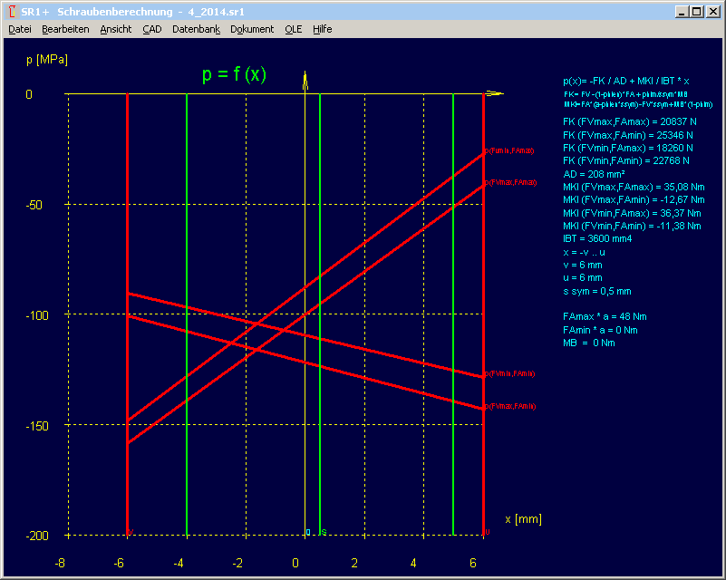 Die Trennfuge geht von V nach U. 0 ist die Mittelachse bzw. Schwerpunkt, S ist die Schraubenachse. Falls FAmax = FAmin ist die Biegebeanspruchung statisch, dann gibt es nur die Linien p (FVmax) und p (FVmin). Für alphaA=1 (ohne Toleranzen) gibt es nur eine Kurve. Sonst wird der Verlauf mit FAmax und FAmin sowie FVmin und FVmax berechnet.