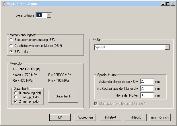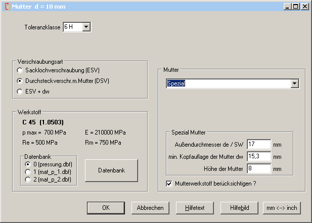 Wenn man für die Schraube einen Sonderkopf wählte, kam bislang meist die Meldung "D=xx nicht gefunden – Append dbf" und die Größe musste zuerst in der Datenbank nachgetragen werden. Jetzt wurde für alle Gewindegrößen ein Sonderkopf nachgetragen mit Kopfhöhe 3d, Außendurchmesser 4d und Lagerdurchmesser Dw=3d. Ein derartiger Sonderkopf ist geeignet, wenn keine Kopfschraube, sondern eine in ein Sackloch eingeschraubte Stiftschraube berechnet werden soll. Der Schraubenkopf ist in diesem Fall das Gehäuseteil mit dem eingeschraubten Stehbolzen.